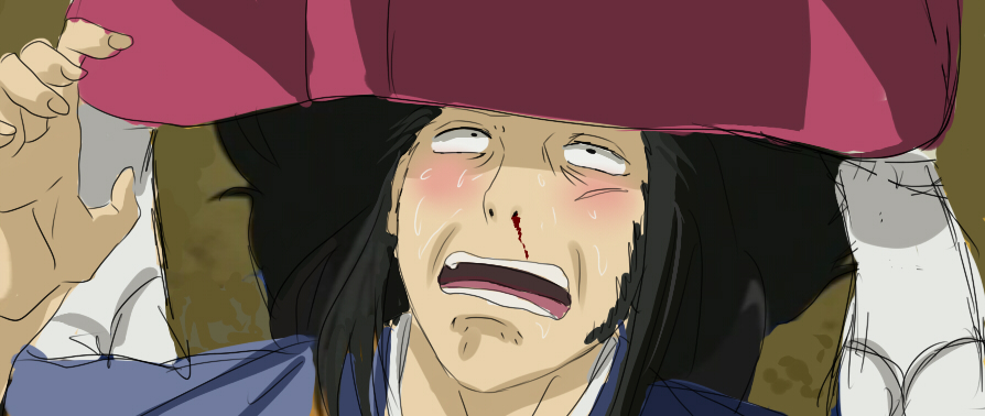 三成に無理やり着物の中をのぞかされた左近の図